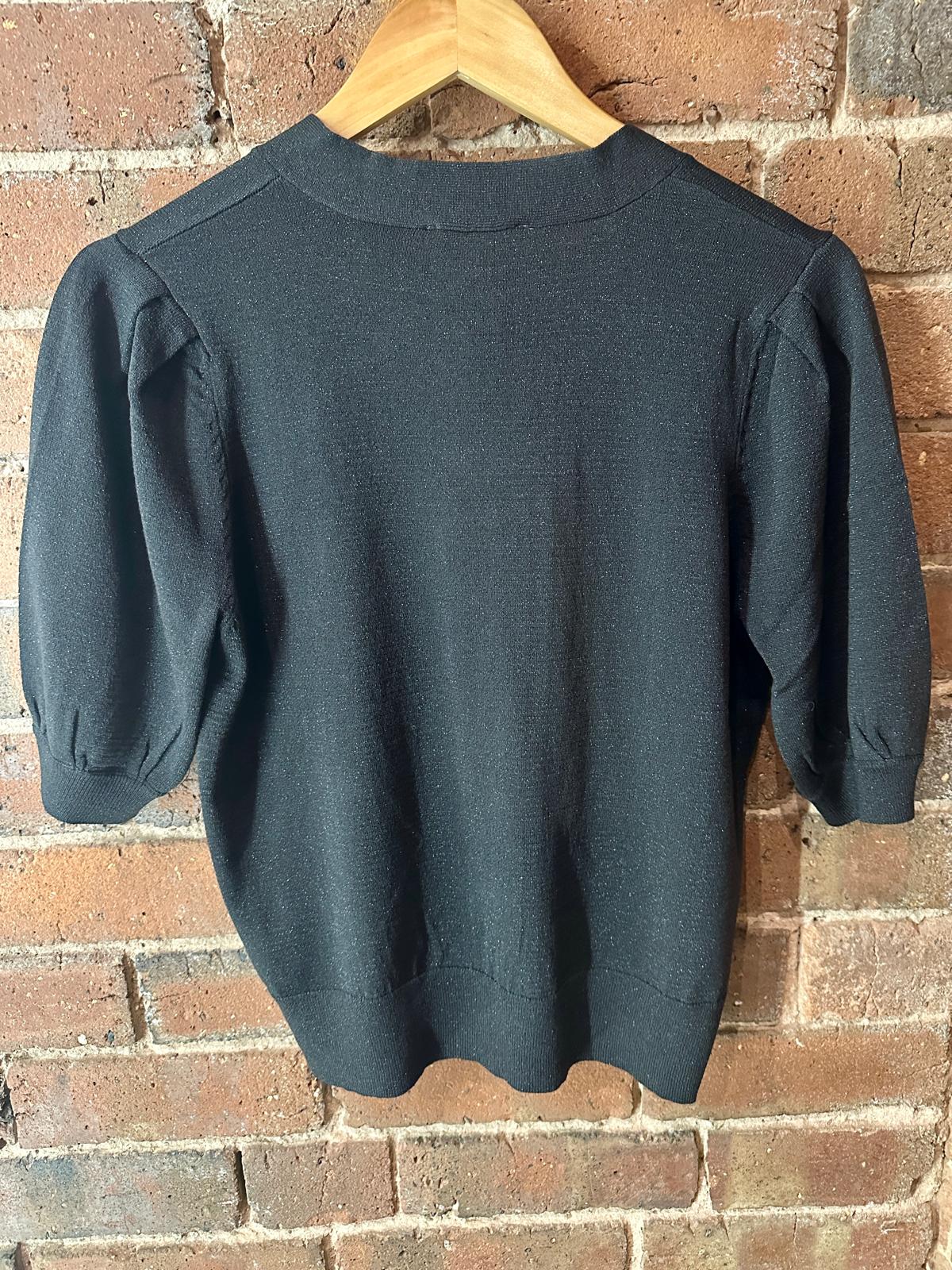 This stylish black top combines elegance and comfort, featuring a soft, lightweight fabric that’s perfect for both casual and semi-formal occasions. The top is designed with a delicate bow tie detail at the neckline, adding a touch of sophistication to the simple yet chic silhouette. It has short, puffed sleeves that enhance its feminine appeal and a ribbed hem that provides a snug, flattering fit.