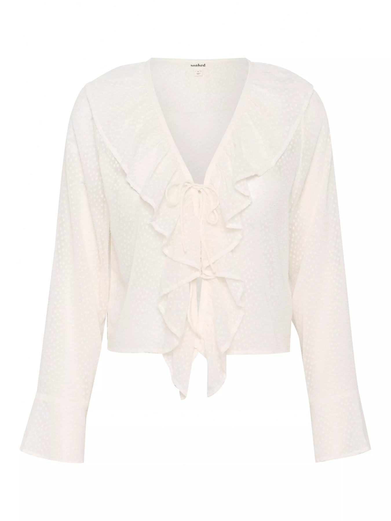 Detailed with ruffles, this blouse from Soaked In Luxury is great for everyday. Refreshed with timeless spots and framed with a v-neckline and long sleeves.
